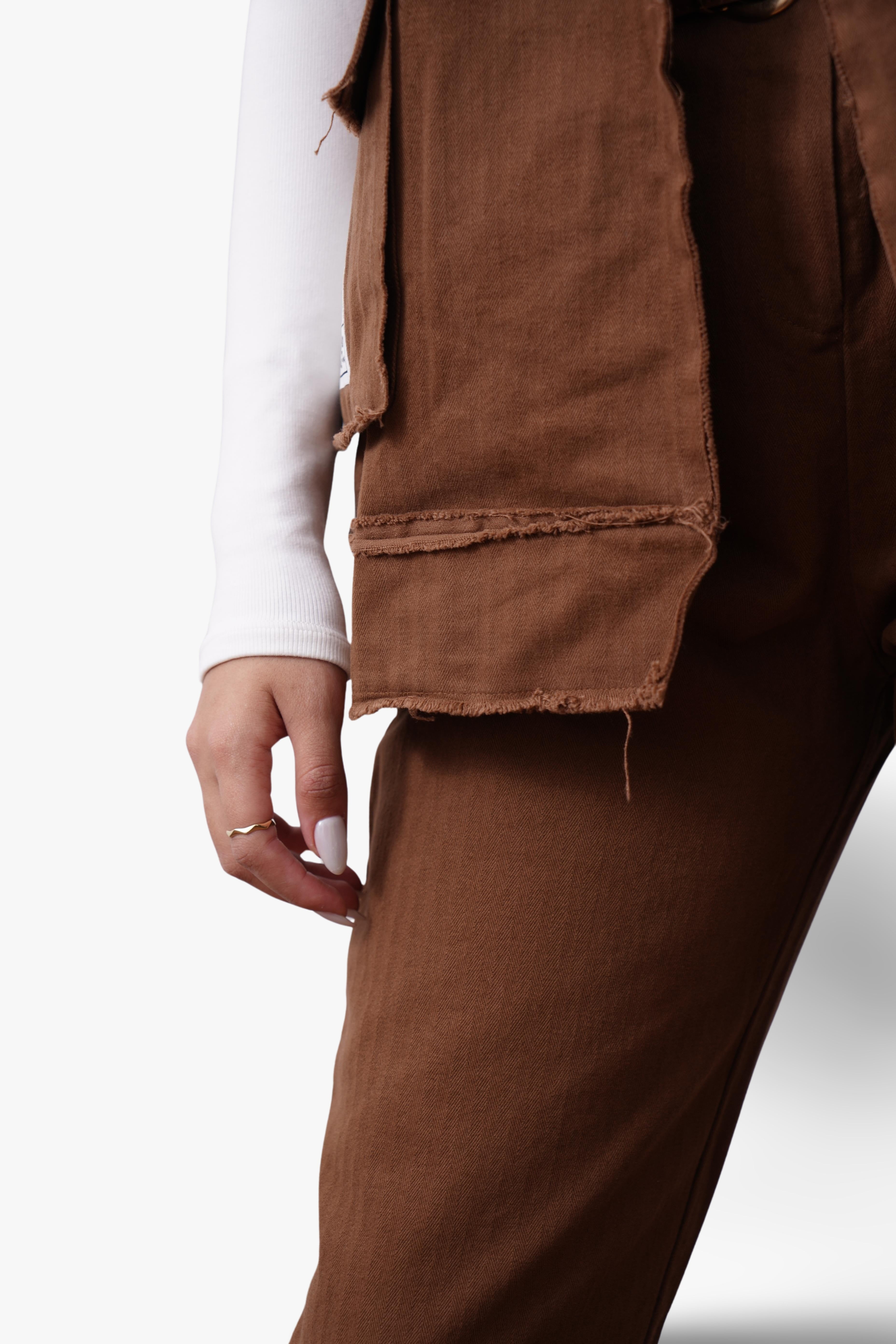 A sleeveless utility vest with raw-edge detailing, cut for a relaxed fit. Crafted in a warm rust tone for an effortlessly modern look.